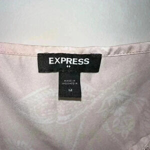 Pre-owned Express brand women's size medium top. Features a blush pink, floral print on a silky polyester-like fabric. The top has a ruffled neckline with delicate lace trim and spaghetti straps. Minor discoloration is visible near the neckline. Made in Indonesia.