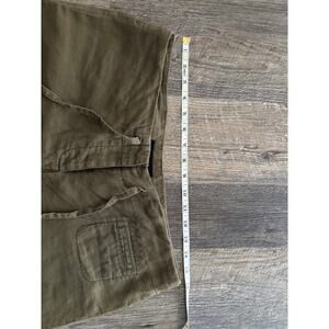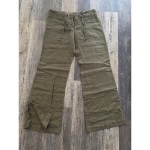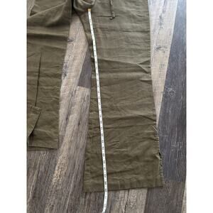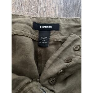 These are women's drawstring pants from Express are an olive green and made from 100% linen. They feature a relaxed fit, ideal for casual wear. They are a size 7/8.
