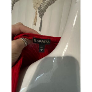 This is a pre-owned Express brand, red, long-sleeved sweater. The sweater features a V-neck design and a ribbed texture throughout. The material appears to be a knit blend. The size is medium. There are no immediately visible stains, tears, or other significant imperfections. The garment is displayed on a mannequin, suggesting it is in wearable condition.