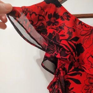 Women's elegant Express red and black floral print sheer tank top with ruffled sleeves and with belt loops in XS. Neckline is a beautiful combination of semi-sweetheart and V-shaped. Made in China. 100% polyester. Machine washable.