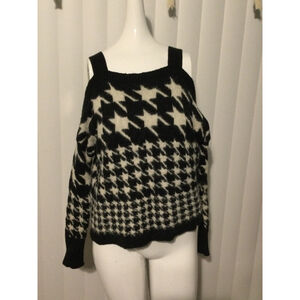 This is a pre-owned Express sweater, size small. It features a black and white houndstooth pattern. The sweater has a unique cold-shoulder design with shoulder straps. The material appears to be a soft knit blend. There are no visible stains or tears. The sweater shows minimal signs of wear, consistent with pre-owned condition. The garment's dimensions are typical for a size small sweater.