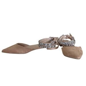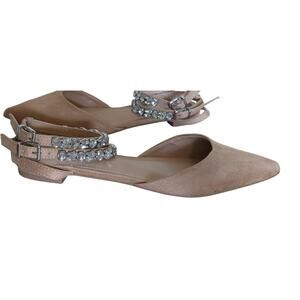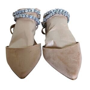 Women's Express Brushed (faux suede) Tan w/Rhinestone Embellished Double Ankle Straps Flat Shoes. This Esquisite pair of Flats are so Stunning. The toe is enclosed boasting a pointed toe pump styling with an open sling back style heel strap and Double ankle straps that are both completely Embellished with Diamond/Round Rhinestones for Sparkle from every angle and have sliver tone buckles. Heel is 0.5" block styling. Sole has non slip grooves. Fabric is a soft, brushed material in go with everything tan. Insole has a bit of padding allowing for all day comfort. Express branding speaks of Stylish, Fashionable and Trendy items that don't disappoint and these shoes are so Pretty with Bling that makes them a one of a kind find that will get endless compliments that allow wearing with dress up or adding a bit of sparkle with dress down. Size women's US 7