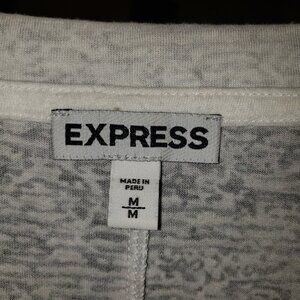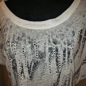 This Express stylish women's white and black graphic tee is perfect for a casual look. The lightweight, sheer fabric is comfortable and breathable, making it ideal for warmer days. The eye-catching graphic print and embellishments add a touch of personality to any outfit.