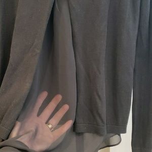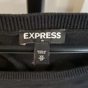 Darling black Express sweater. Back is extra cute with a sheer panel showing under a cross crossed sweater back. Size XS. 23" long to shorter sides. 16.5" underarm to underarm.