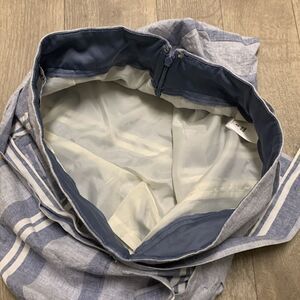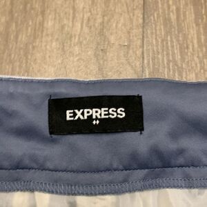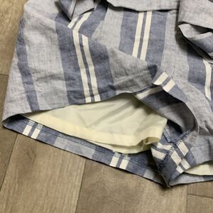 16” from top to bottom 3.5” inseam 34” waist. Zips on the side. Size 12. Blue/white color.