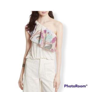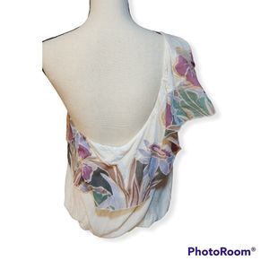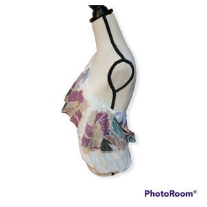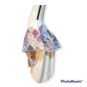 Flirty casual bubble hem for easy styling, loose fit. Ruffle overlay. Armpit to armpit 22", mid shoulder to hem