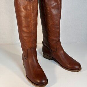 Frye Brown leather tall boots with solid 1" heels, pull-up tabs, and comfortable rounded toes