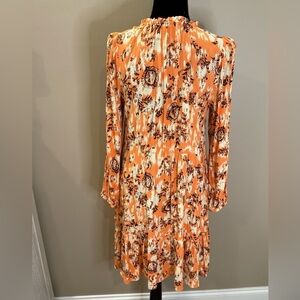 Side pockets. 100% Rayon. Length 37 1/2". Color Cadmium Orange Combo. This dress has a charming ruffled neckline and a classic button front design. Wear with sandals for a casual look, heels for a night out, or boots for a fun flirty look! Accessorize with a belt and/or hat! MSRP $159.