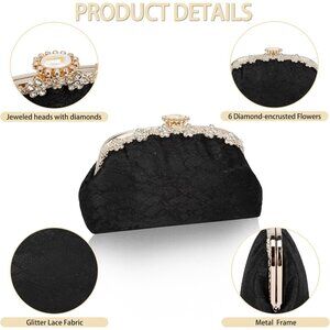 SPARKLING LACE FABRIC - The clutch purses for women are made of light and sparkling lace fabric, with a semi-circular design and an inlaid gemstone at the top, and 6 small flowers with rhinestones on the side of the opening, which gives you an aristocratic and elegant temperament