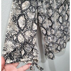 Slither into style with this snake print top. It's comfy and perfect for blending into your natural habitat—or standing out in a crowd. Ties at the Neckline and sleeves add a playful touch. Who needs a boa when you've got this beauty?