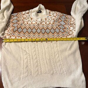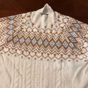 keywords: Fair Isle sweater, winter fashion, cozy knit, turtleneck sweater, women's sweater, acrylic blend, knit pullover, Forever 21 clothing, medium size, China made, cable knit sweater, warm clothing, multicolor sweater