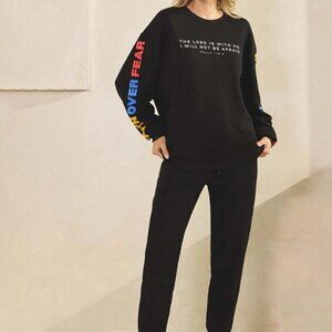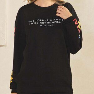 Stay cozy and inspired in this Women’s Faith Over Fear Scuba Pullover Sweatshirt — the perfect blend of comfort, style, and encouragement. Designed with a relaxed silhouette and motivational sleeve print, this piece is ideal for casual wear, lounging, or layering year-round. ✅ Details: Color: Black Condition: New Crew neck for a classic look Dropped shoulder for a relaxed, oversized fit Soft, ultra-comfy scuba knit fabric Full-length sleeves with cuff bands “Faith Over Fear” printed boldly down both sleeves Fabric: 45% Rayon / 47% Polyester / 8% Spandex This long sleeve pullover sweatshirt pairs effortlessly with leggings, joggers, or jeans for everyday wear. Lightweight yet cozy, it’s the perfect faith-inspired top for cooler days, church gatherings, or casual outings.
