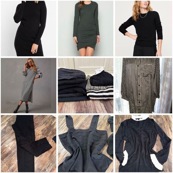 This women's fall clothing lot includes 9 pieces in size M/L, featuring a mix of stylish brands such as Vici, Banana Republic, and more. The lot includes a variety of items like sweaters, dresses, t-shirts, dress shirts, pants, and tanks, perfect for various occasions from casual to formal. The clothing is made from a blend of fabrics including polyester, nylon, silk, wool, and cotton, offering features like compression, lightweight feel, stretch, and breathability. This lot is a great addition to your wardrobe for the fall season, offering a mix of high-end fashion and versatile pieces.