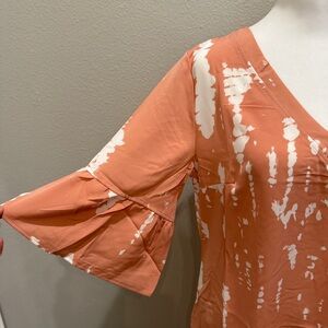 Stylish peach and white tie-dye dress with a V-neck and flared sleeves. Perfect for casual outings.