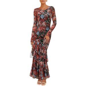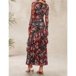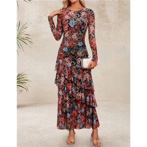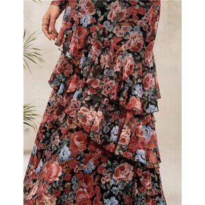 The layers ruffle hugs your figure and create a captivating curves, the elegantly tailored long sleeves and chic floral print add a touch of refinement, making it perfect for cooler evening soirees, whether it's a garden party or a candlelit dinner