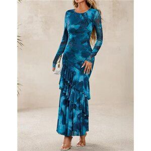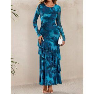 The layers ruffle hugs your figure and create a captivating curves, the elegantly tailored long sleeves and chic floral print add a touch of refinement, making it perfect for cooler evening soirees, whether it's a garden party or a candlelit dinner