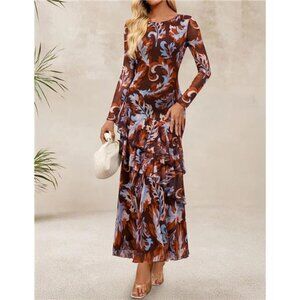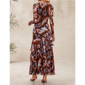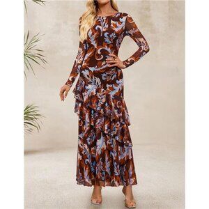 The layers ruffle hugs your figure and create a captivating curves, the elegantly tailored long sleeves and chic floral print add a touch of refinement, making it perfect for cooler evening soirees, whether it's a garden party or a candlelit dinner
