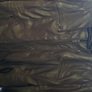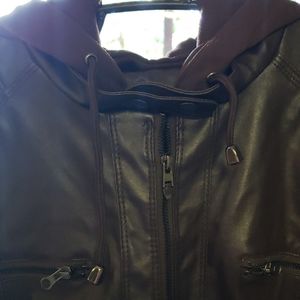 NWOT!!! Looks great with leggings and boots! Always a fall favorite!! Was too tight in the arm area for me! Cloth part is detachable and cloth hood can also be detatched!! Only bottom pockets, breast pockets are fake!!