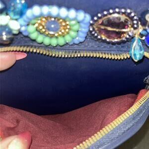 The hardware is gold and the front features the most stunning beaded floral decoration which appeara to be real glass crystals in hues of periwinkle aquamarine teal and purple!