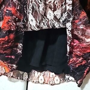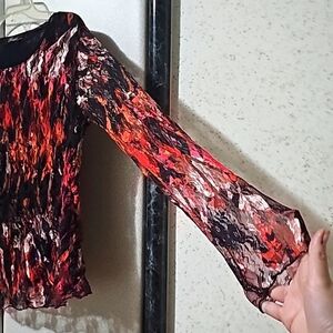 Like new. Tag cut off. Sheer abstract patterned outer layer, lined with a black camisole. Sheer unlined sleeves. Gorgeous fancy look.