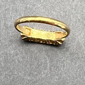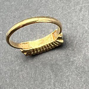 This vintage gold tone fashion ring features a bold rectangular setting with a grid of sparkling clear rhinestones. The symmetrical layout of 12 stones creates a glamorous statement, perfect for cocktail parties or everyday sparkle. Lightweight and eye-catching, this ring adds vintage charm to any jewelry collection.