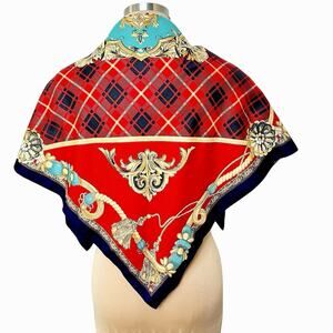 Womens Fashion Scarf Red Blue Gold Accent Tartan Rope Print Square 34x35