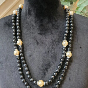 Womens Fashion White Faux Seed & Black Seed Pearls Two Strand Necklace Jewelry