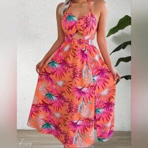 Women's Fashionable Summer Vacation Style Floral Print Halter Neck Slit Dress