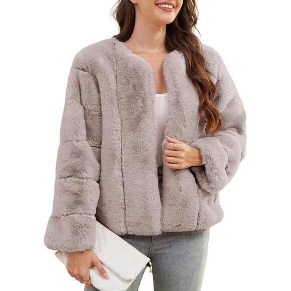 Women's Faux Fur Coat Long Sleeves Open Front Warm Winter Cropped Jacket Khaki