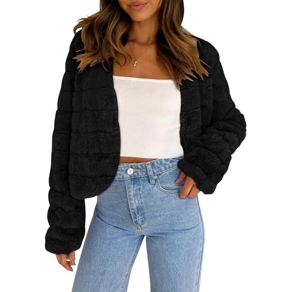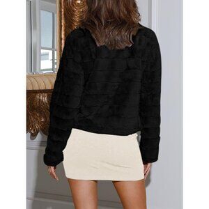 Women's Faux Fur Coats Fleece Cropped Jacket Long Sleeve Shaggy Warm Black