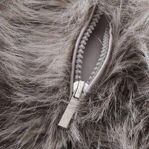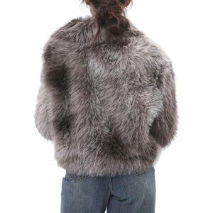 A faux fur jacket featuring dropped long sleeves, wide lapels, and a zip-up front