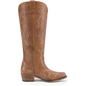 Womens Faux Leather Brown Knee High Chunky Heel Side Zipper Embroidered Boots