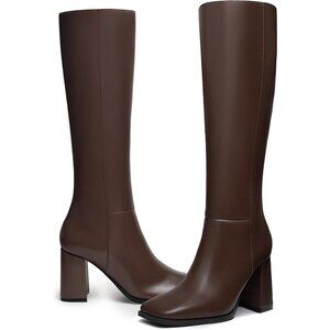 Women's Faux Leather Brown Square Toe Side Zipper Chunky Heel Knee High Boots