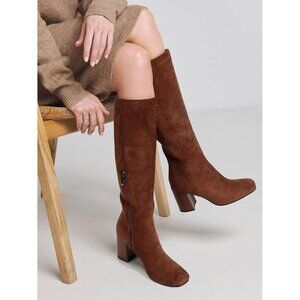 Women's Faux Leather Brown Suede Square Toe Knee High Chunky Heel Side Zip Boots
