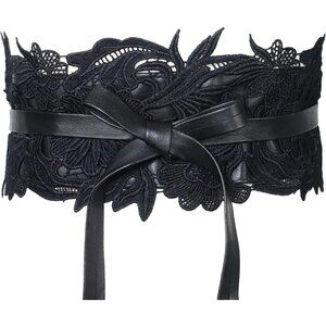 Features: Wide obi-style belt made of soft faux leather and delicate lace, designed to cinch and define your waist. The long removable strings let you tie it in front or back, creating a versatile look — perfect for shaping your silhouette or adding a stylish detail to dresses, blouses, or coats. The elegant lace detail adds charming texture, making it a statement accessory for special occasions or everyday wear.
