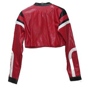 Red, black, and white women's faux leather racer jacket. Size medium. Fits true to size.