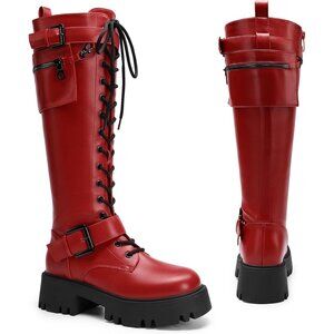 ⚡ Women's Faux Leather Red Knee High Lace Up Inside Zipper Combat Boots