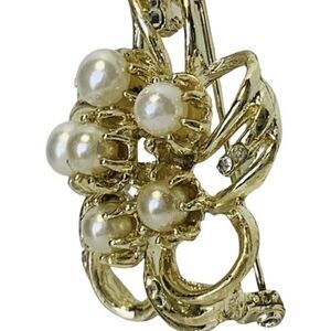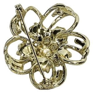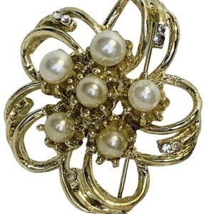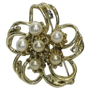 Women’s Faux White Pearl 3D Shimmering Rhinestone Gold Tone Flower Brooch pin 2”