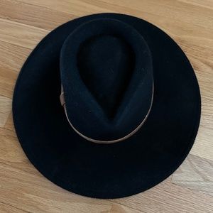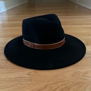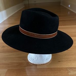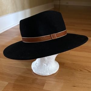 Womens Fedora Flat Brim Black Wool Hat Size Large. 100% wool. 7/8" wide velvet like brown hat band. Flat, stiff brim that holds its shape. 3 3/4" brim, and 4 1/2" crown at tallest point. Size Medium'Large, but I feel Large is most accurate. Excellent, clean condition.