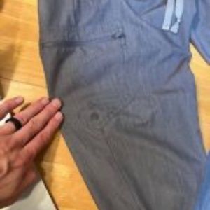 Good condition. Note that the joggers have gray drawstrings, not blue like the picture. Has a small stain the size of a nickel on the leg by the zipper (see pic). Could probably come off with stain remover.