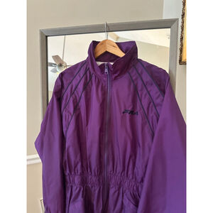 This is a pre-owned Fila jacket, size M. The outer shell is made of 100% nylon and features a purple color with black accents on the sleeves and shoulders. It has a full zipper closure and a gathered waist. The jacket shows minimal signs of wear. The interior lining is white and appears to be in good condition. There are no visible stains or tears.