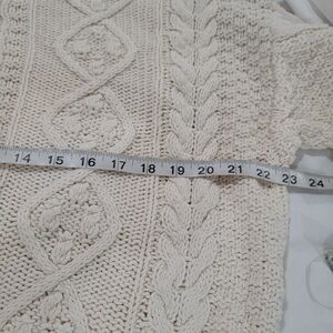This women's fisherman cardigan in size small is a classic ivory cable knit sweater with a chunky knit design and button accents. Made from a blend of ramie and cotton, this heavyweight sweater is perfect for the colder seasons of winter, fall, and spring. The long sleeves and crew neck neckline make it versatile for both travel and casual occasions, while the regular fit ensures a comfortable and stylish look. This timeless piece is a must-have for any wardrobe, adding a touch of sophistication to any outfit.