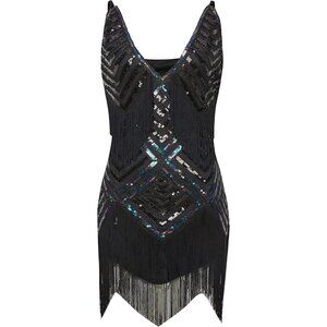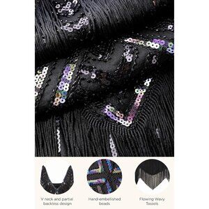 Features: A stunning midi-length flapper dress with a fitted silhouette that screams vintage elegance. Fully lined with sequins and beads, it features a deep V-neck in both front and back, sleeveless with adjustable straps, and playful long tassel trim at the chest and hem. Soft, breathable polyester feels comfortable to wear for hours of dancing or parties. The classic Art Deco striped design gives it a charming, old-Hollywood vibe, making it a show-stopper for Gatsby-themed events, jazz nights, Halloween costumes, or any special celebration.