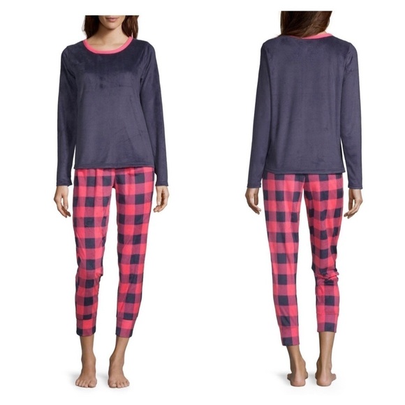 Womens Fleece 2 Pc Pajama Set Pink Blue Checkered