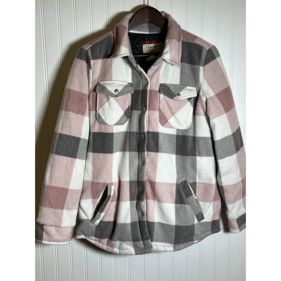 Women’s Fleece Jacket Pink Grey White Plaid Size S Casual School Outdoors