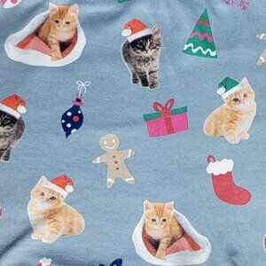 - Grey blue with all-over holiday print featuring kittens, trees, ornaments and presents.