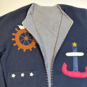 Women’s Fleece Open Front Cardigan Jacket Nautical Appliqué Whip Stitch Navy