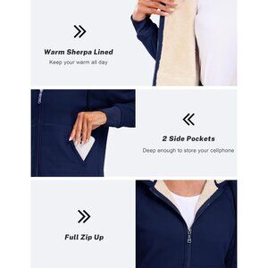 Features: Soft and plush sherpa lining makes this hoodie super cozy for chilly days. Classic full zip design keeps out the wind, with handy hand pockets for your phone or keys. Elastic rib cuffs and hem give a snug, flattering fit and keep the cold out. Perfect for layering over your favorite jeans or leggings, whether you're heading out or relaxing at home.