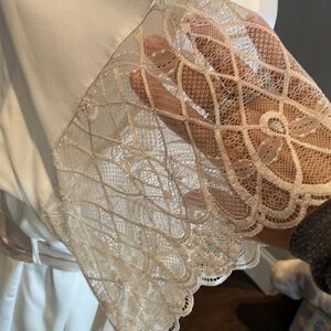 Beautiful robe with gorgeous trim on the arms and hem. Has pretty silver metallic accents in the trim. Would make a great bridal robe!