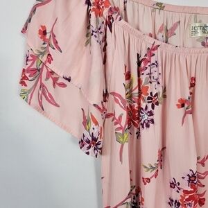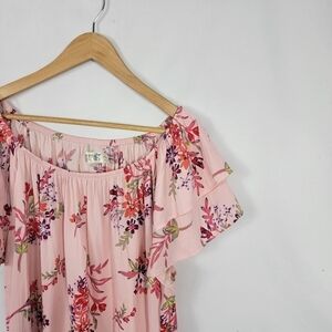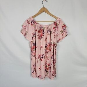 Pink background with Floral Design. Beautiful tunic blouse has double Flutter short sleeves, an elasticized round neck, straight hem w/ side slits. Lightweight, and a light sheen to the fabric.